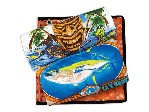 Marlinstar Power Tiki Series Pack includes a Marlinstar Tiki Tomahawk Power Series Long Sleeve Shirt in White and Marlinstar Royal Ahi Tiki Long Sleeve Shirt in Sand; Available in sizes M-2XL, and a Melton Single Pocket Lure Pouch in Orange.
